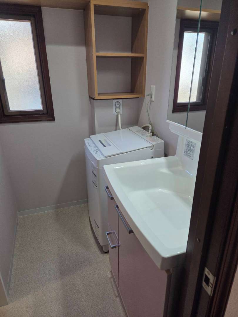 洗面入替と同時に壁紙も貼替、上品なラベンダーを選ばれました。